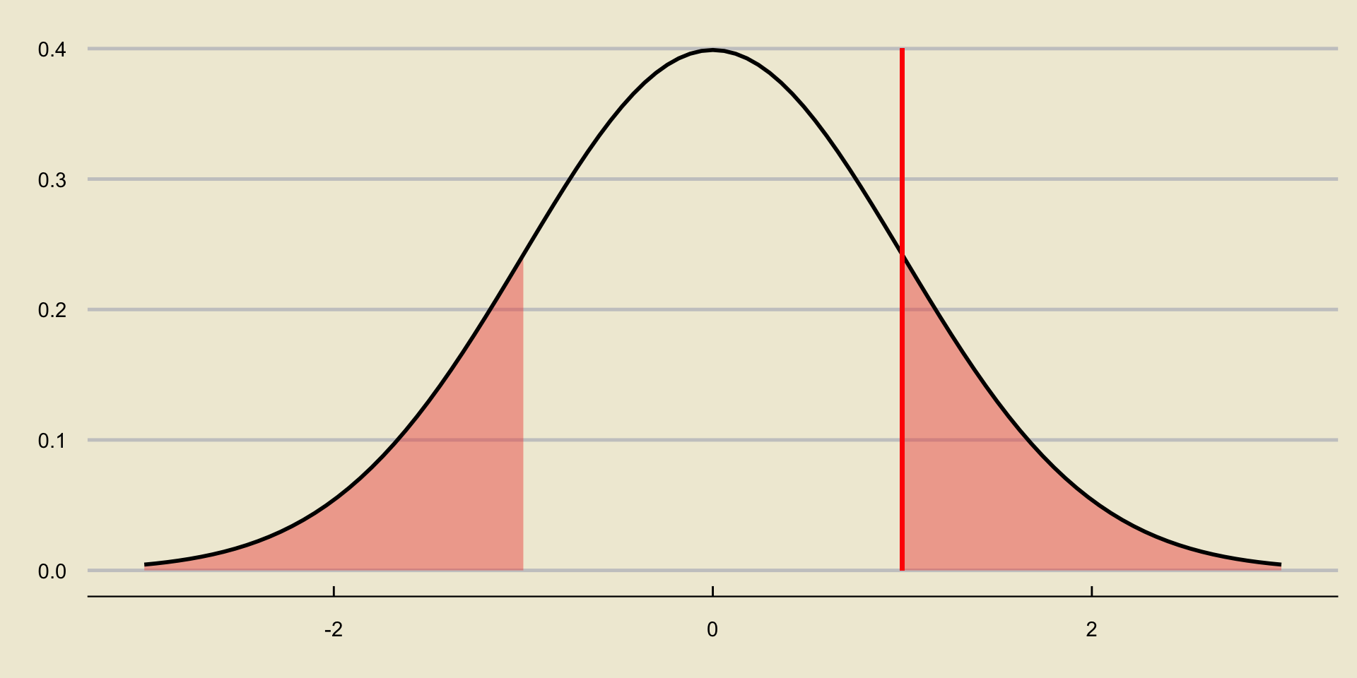 Alternatively, note that we can utilize the symmetry of the normal distribution in our favor- the area we’re interested in is simply twice the area we found in the lower-tailed case!