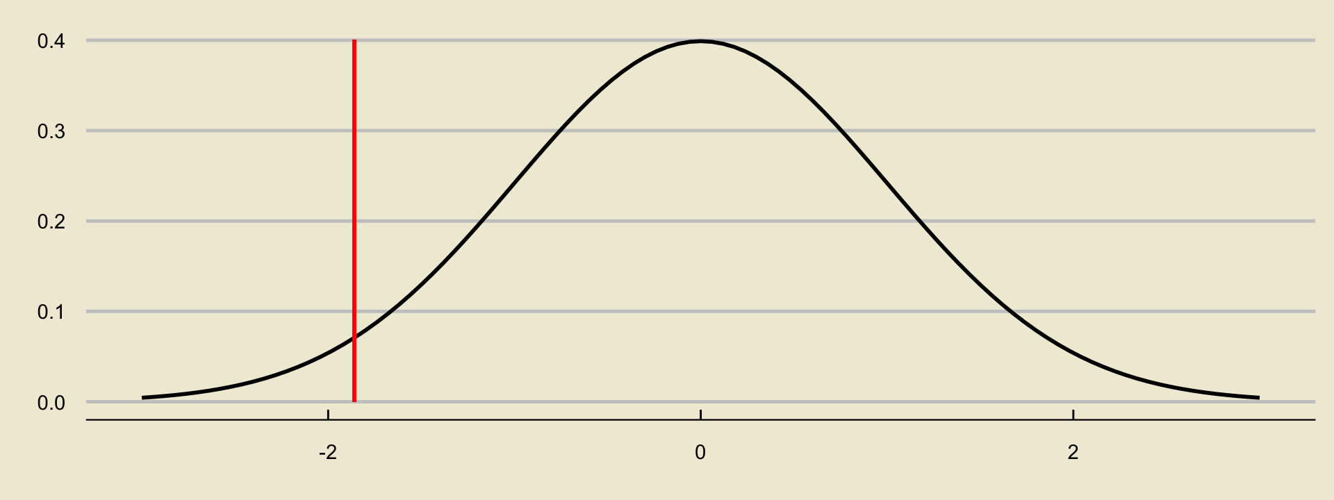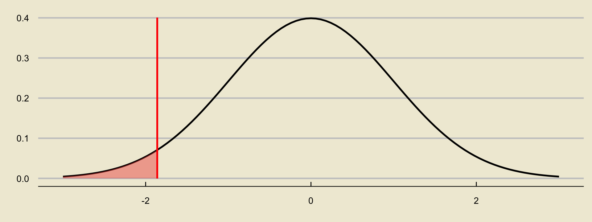 Notice that the area to the left of the test statistic, since we are dealing with a lower-tailed test, is equivalent to “the probability of observing something as or more extreme, under the null, as the value we currently observe”.