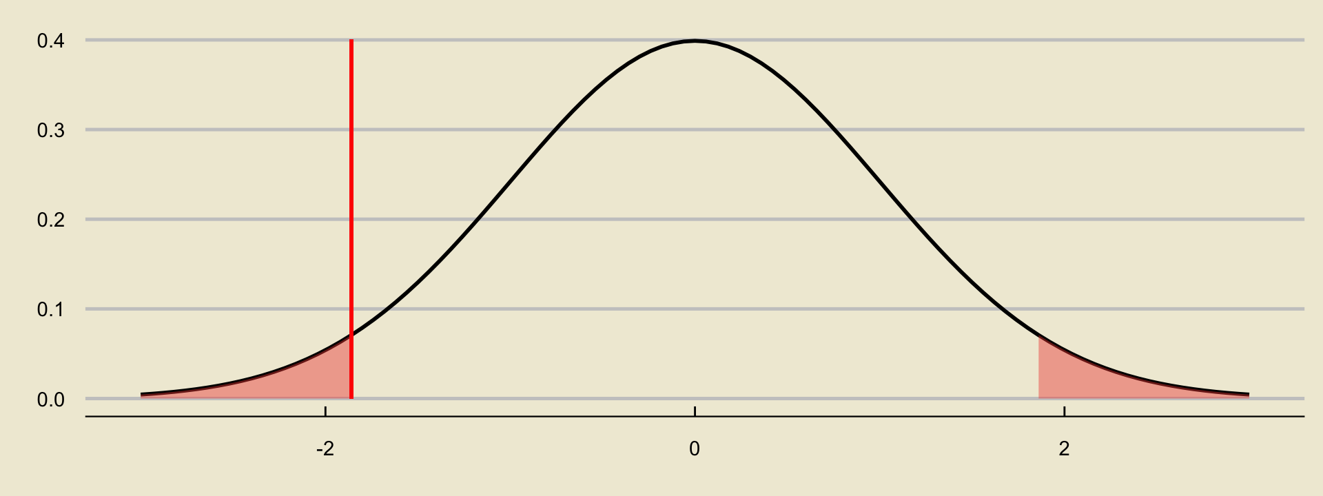 So, our \(p-\)value in the two-sided case is simply \(2 \times (0.0314) = 0.0628\).