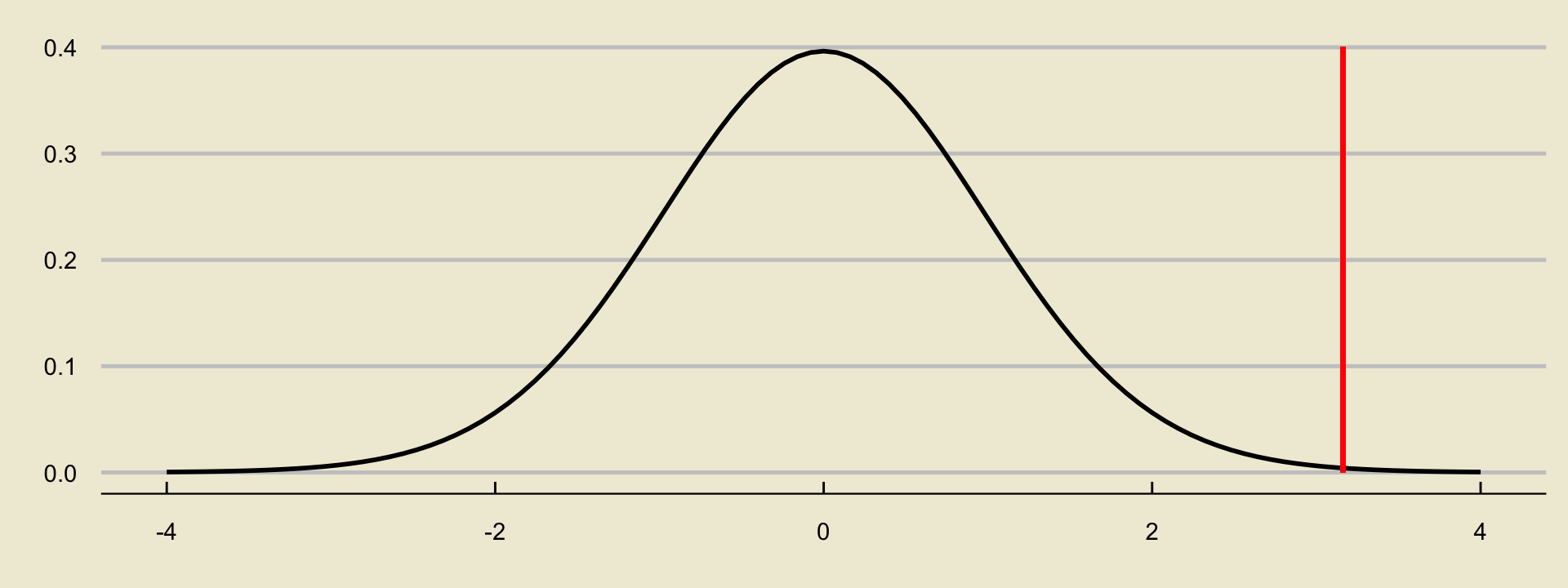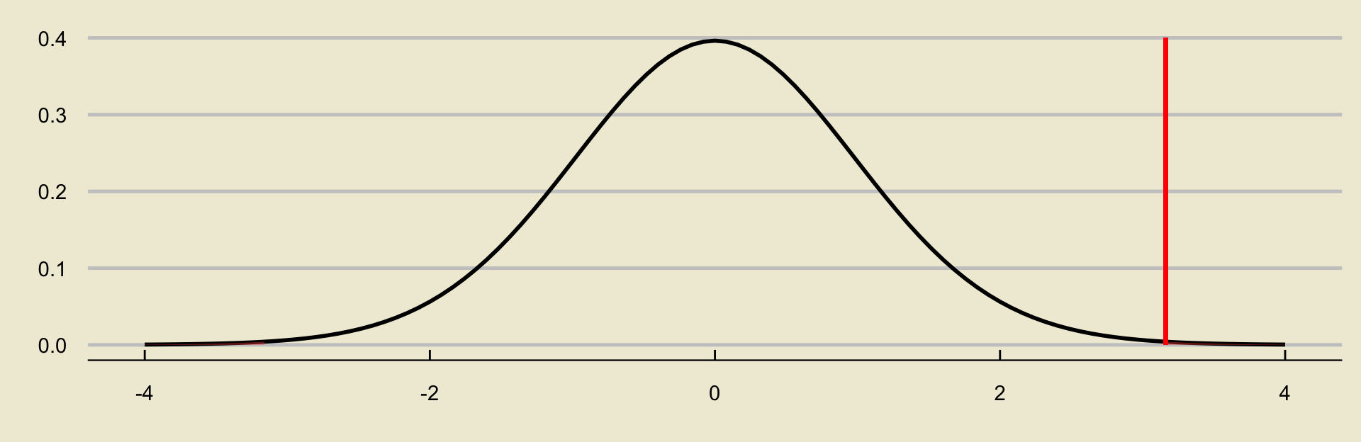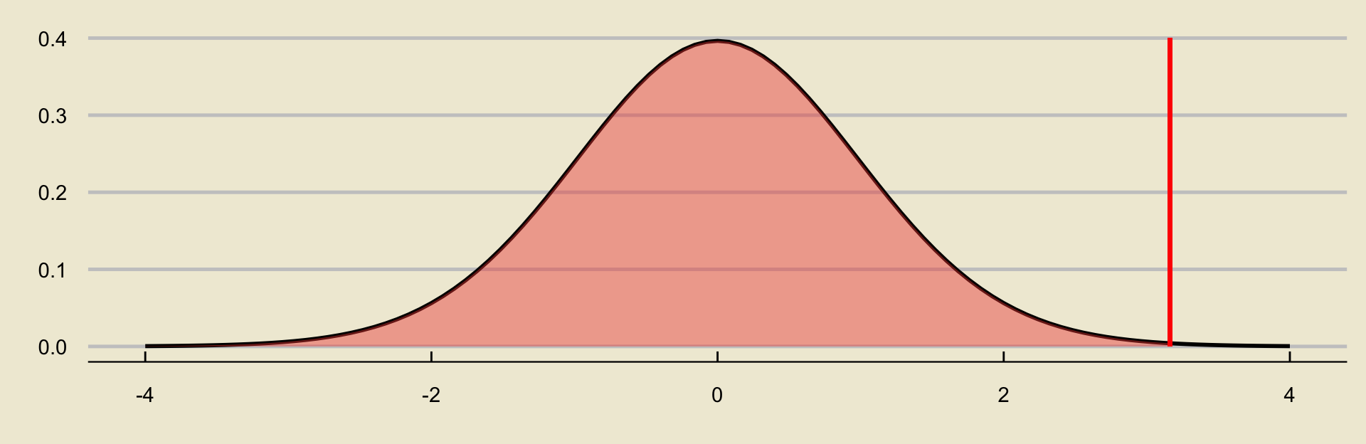 The observed value of our test statistic is \[ \frac{15 - 10}{10 / \sqrt{40}} = 3.162 \]