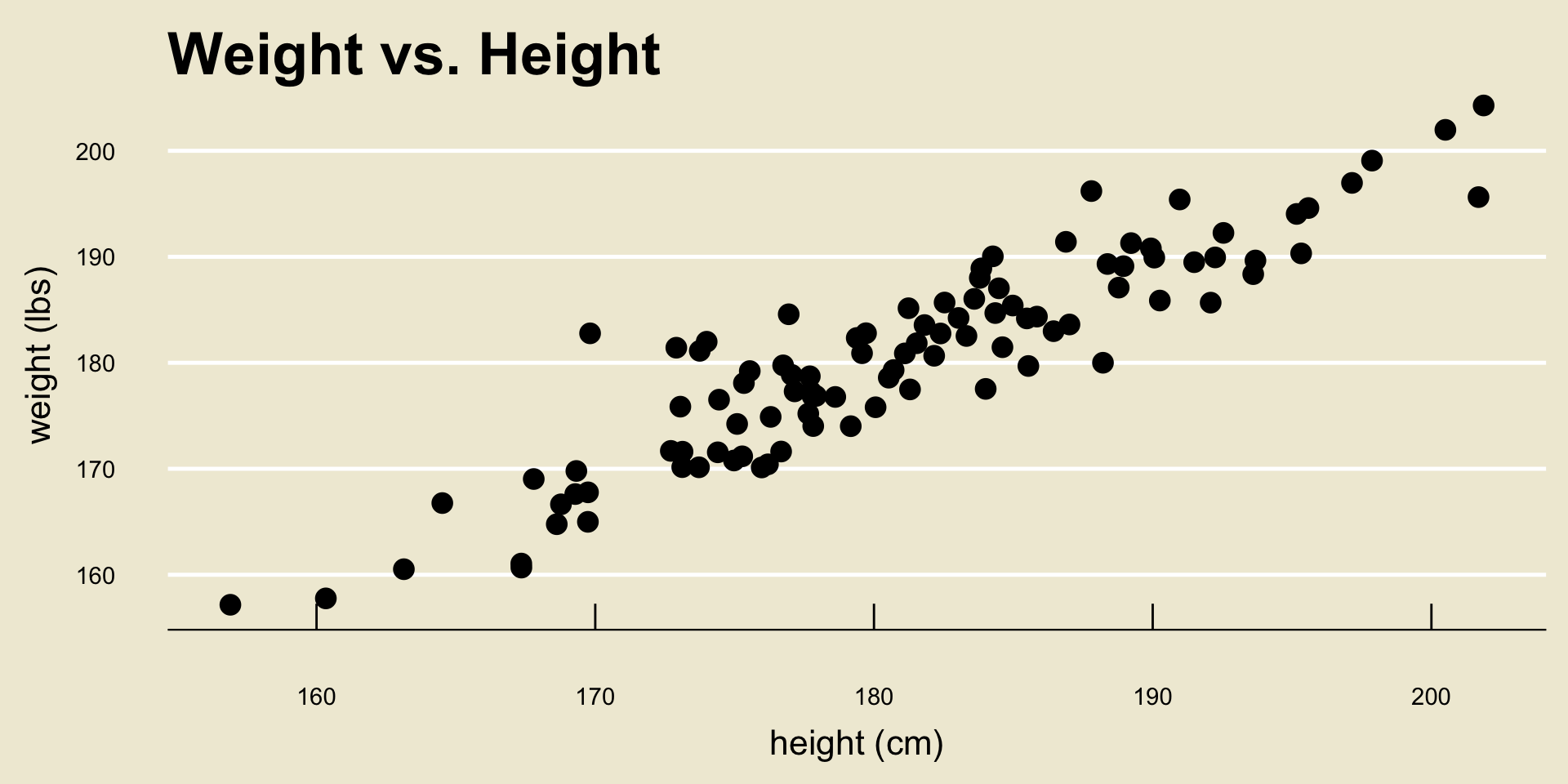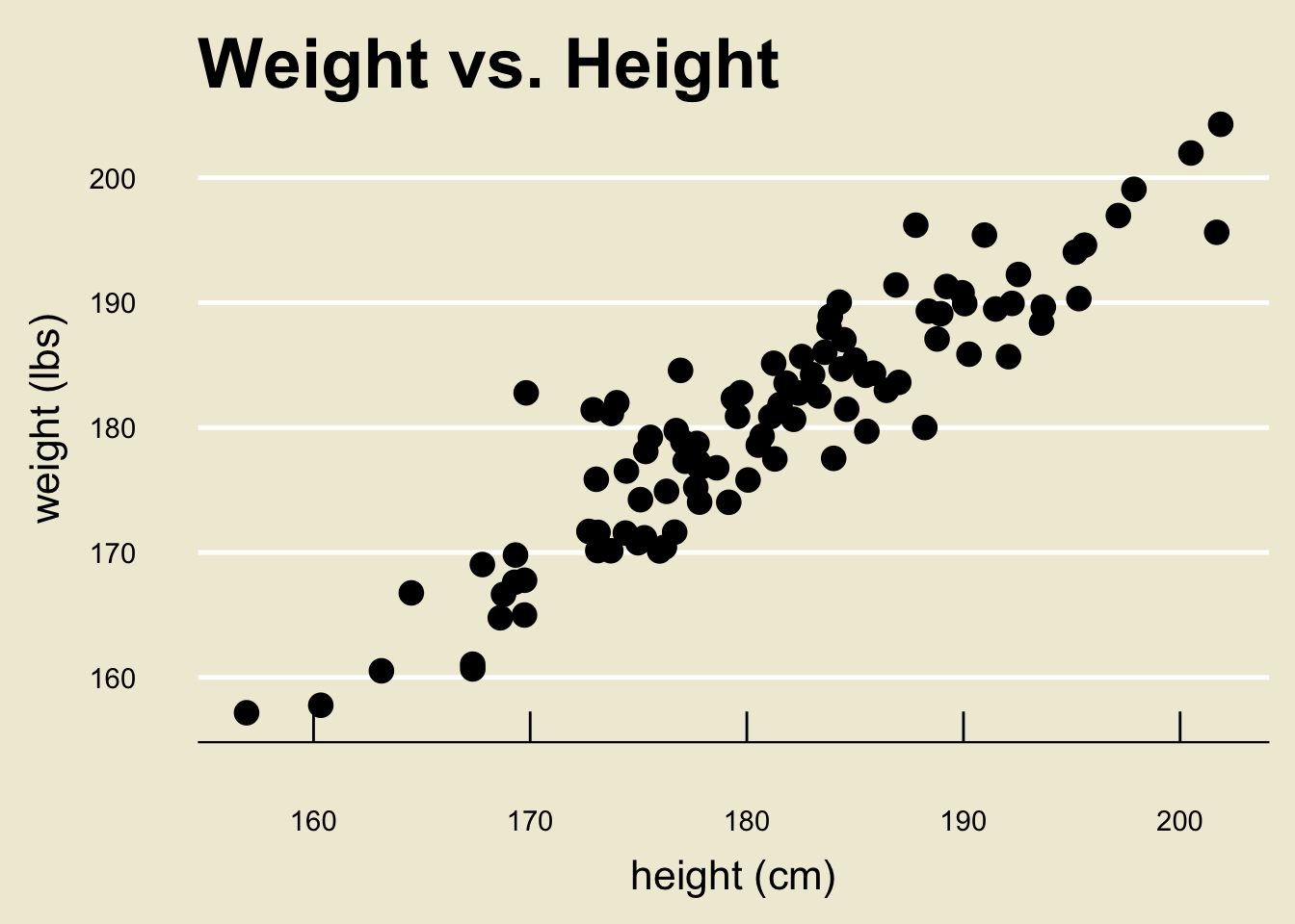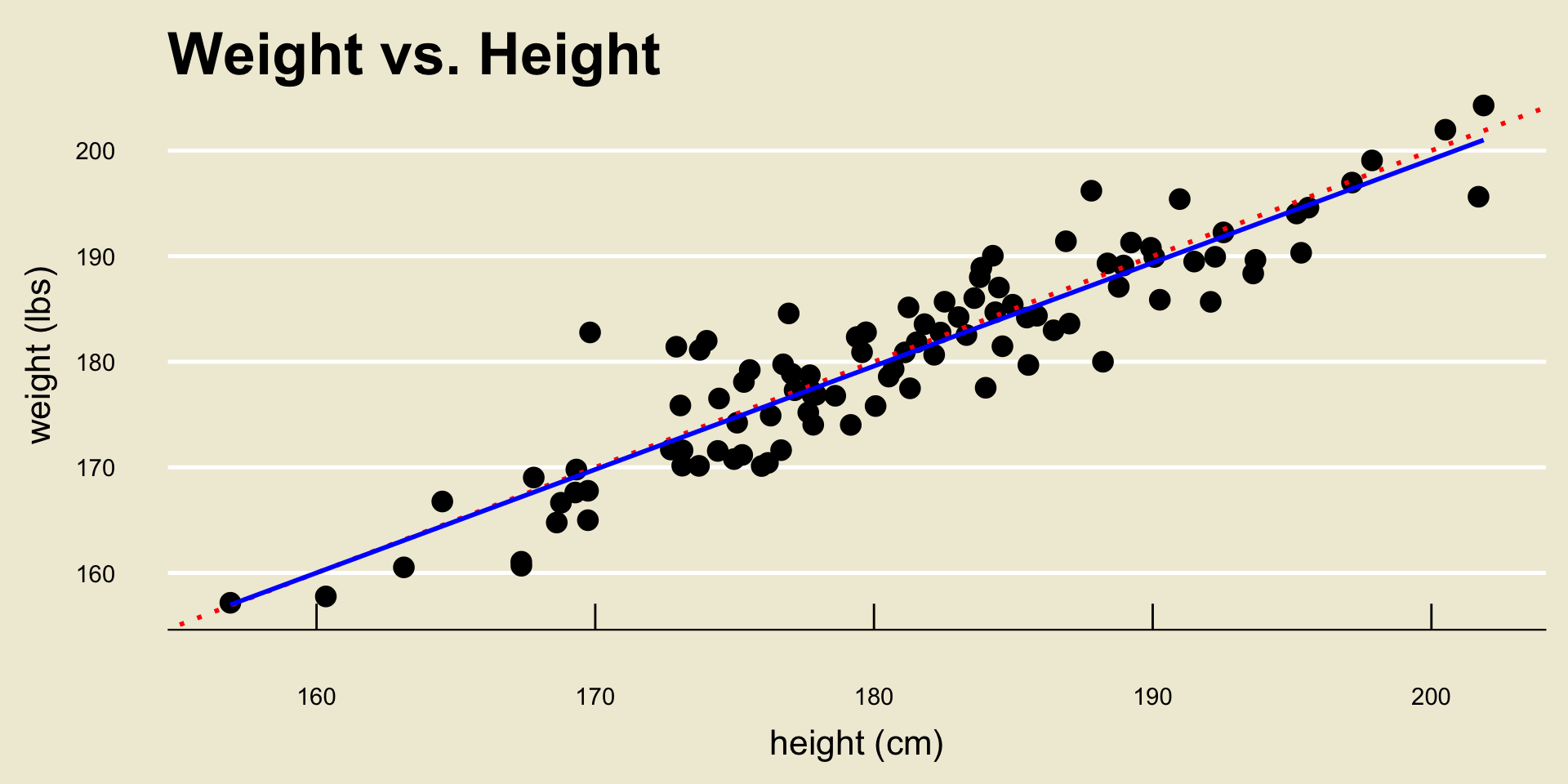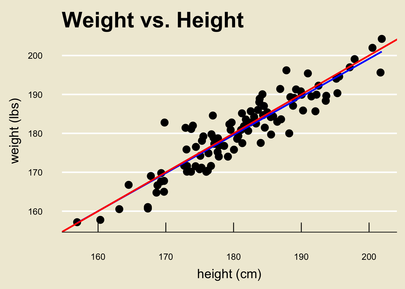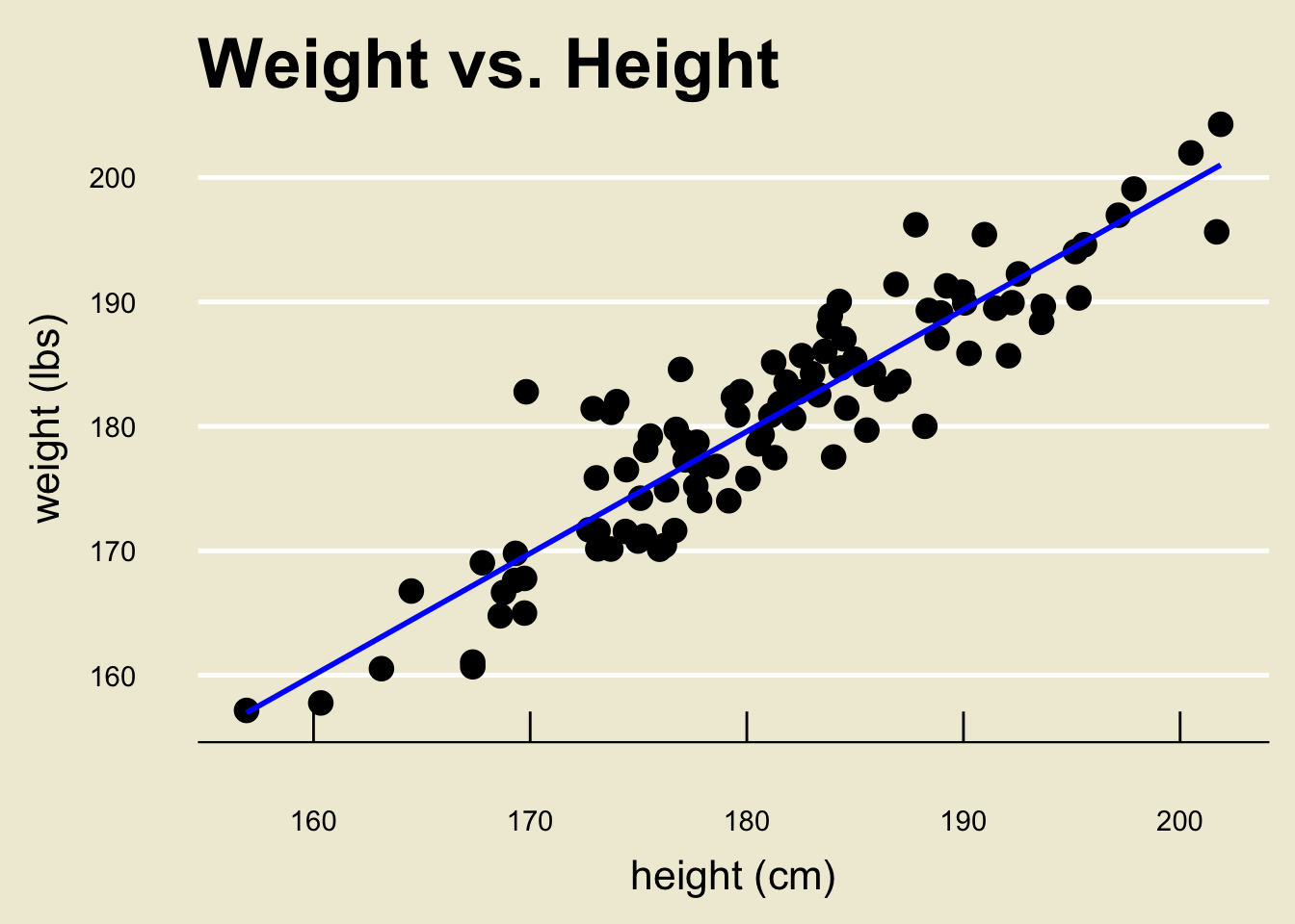 For example, in our height and weight example we found \[ \widehat{\texttt{weight}} = 3.367 + 0.979 \cdot \texttt{height} \]