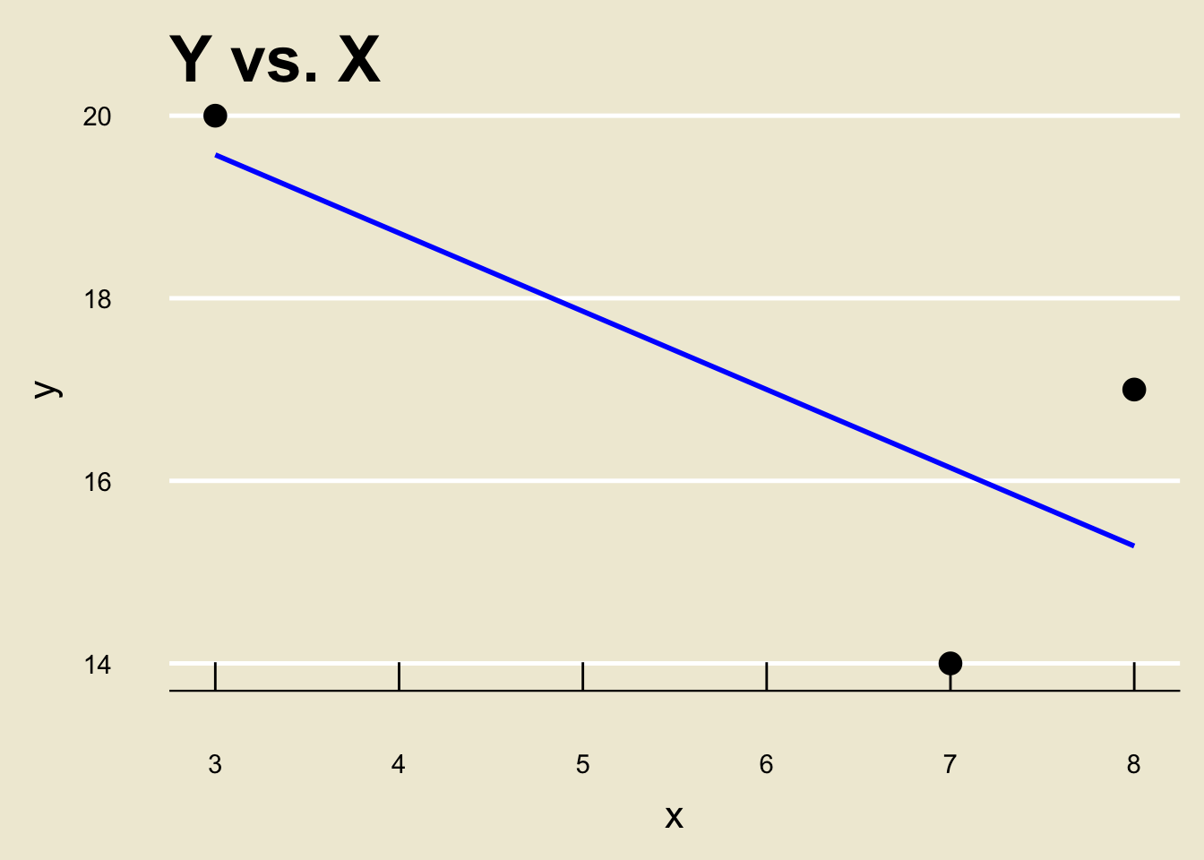 Suppose we have the variables \[\begin{align*} \boldsymbol{x} & = \{3, \ 7, \ 8\} \\ \boldsymbol{y} & = \{20, \ 14, \ 17\} \end{align*}\] and suppose we wish to construct the least-squares regression line when regressing \(\boldsymbol{y}\) onto \(\boldsymbol{x}\).